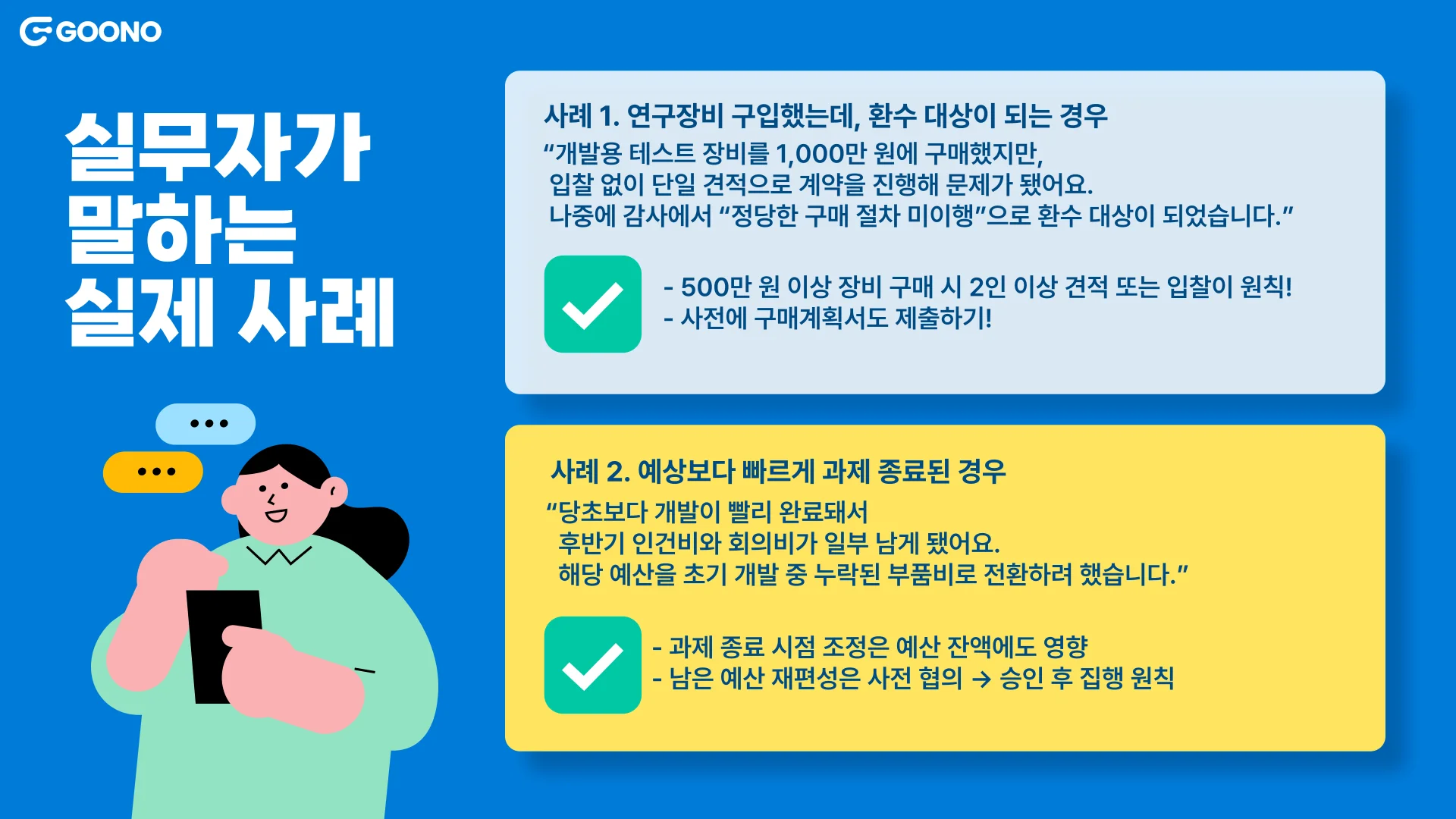 문제점: 정부지원 예산은 인건비, 외주비, 재료비 등 비목 기준에 따라 관리됩니다. 항목이 틀리면 ‘부정 집행’으로 간주될 수 있어요.