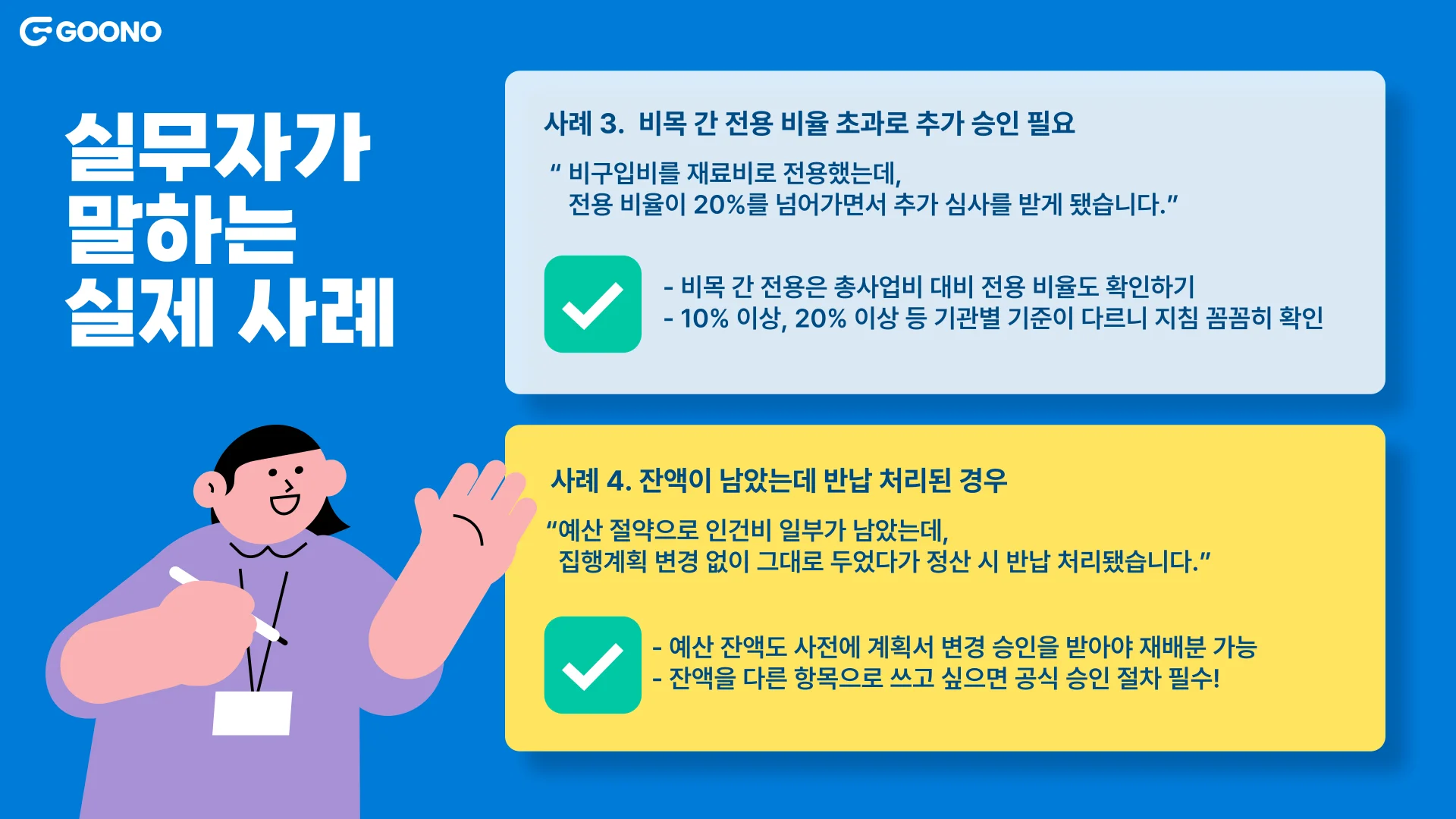 지난 뉴스레터에서는 헷갈리는 예산 항목을 정리해보고, 실제로 실무자들이 얘기해주는 예산계획 변경 사례를 다뤄 봤는데요, 이 실제 사례를 조금 더 듣고 싶다는 분들이 많았어요. 그래서 이번 3탄에서는 그 인기에 힘입어, 현장에서 더 자주 나오는 실무 사례를 풍성하게 추가했어요. 작은 실수라도 나중에 정산에서 큰일로 불거질 수 있는 만큼, 다른 기업들이 실제로 겪은 사례를 생생하게 참고하면 훨씬 도움이 될 거예요.