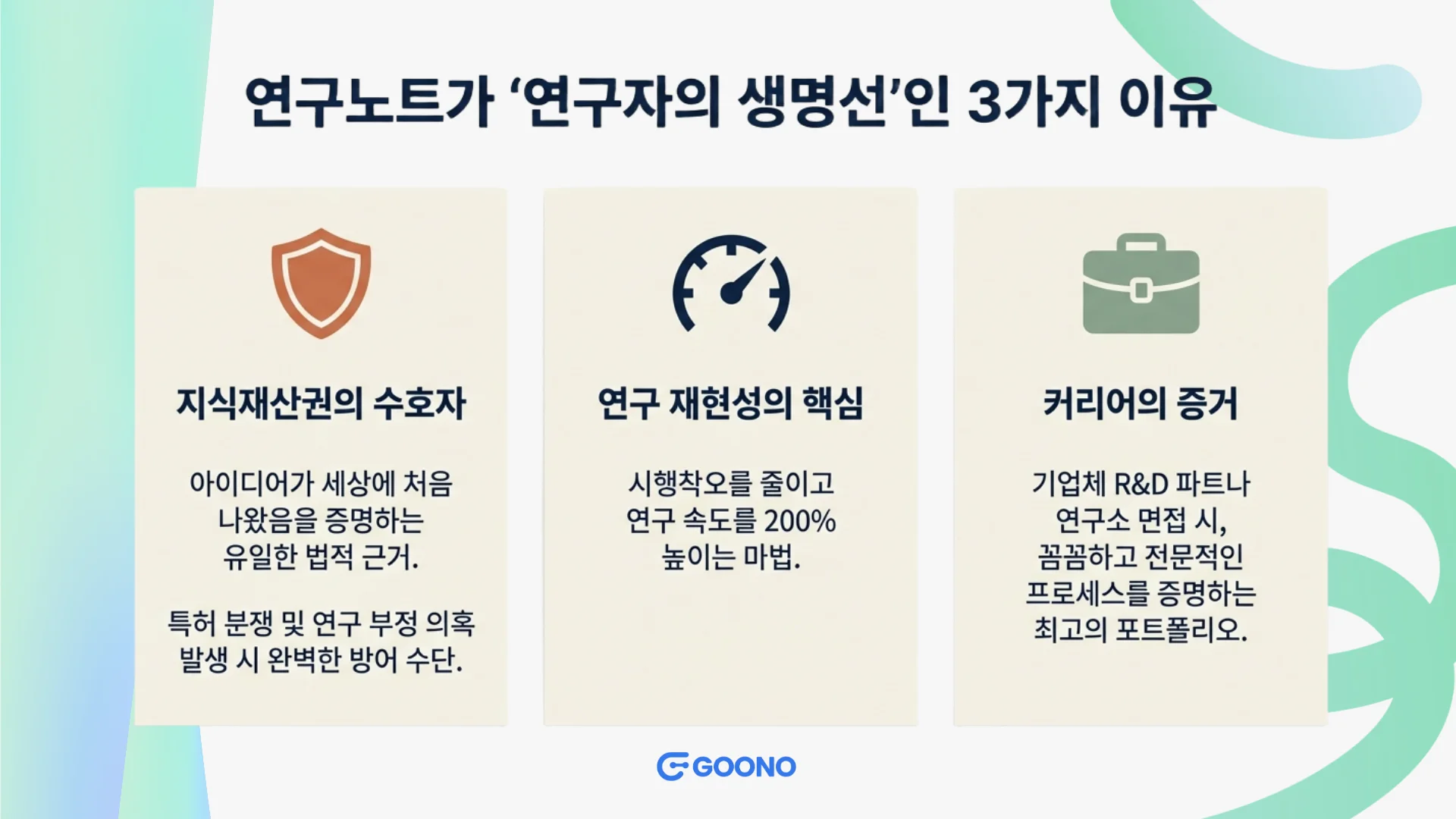 많은 신입 연구원이 연구노트를 '귀찮은 숙제' 정도로 생각합니다. 하지만 연구노트는 여러분의 연구 인생을 지켜주는 가장 강력한 보험이자 포트폴리오입니다.