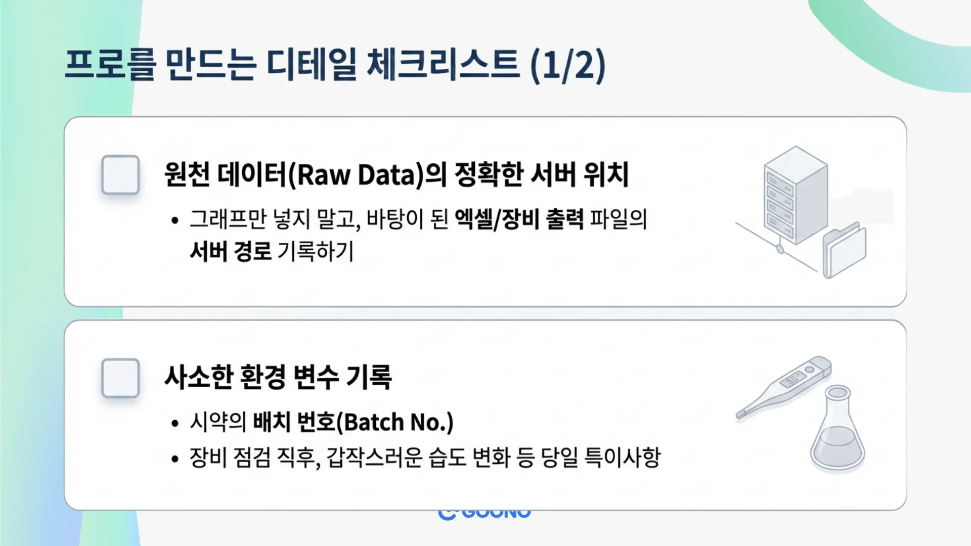 사소한 환경 변수: 실험 결과에 영향을 줄 수 있는 시약의 배치 번호(Batch No.), 당일 실험실의 특이사항(예: 장비 점검 직후, 갑작스러운 습도 변화 등)을 메모하는 습관이 필요합니다.
