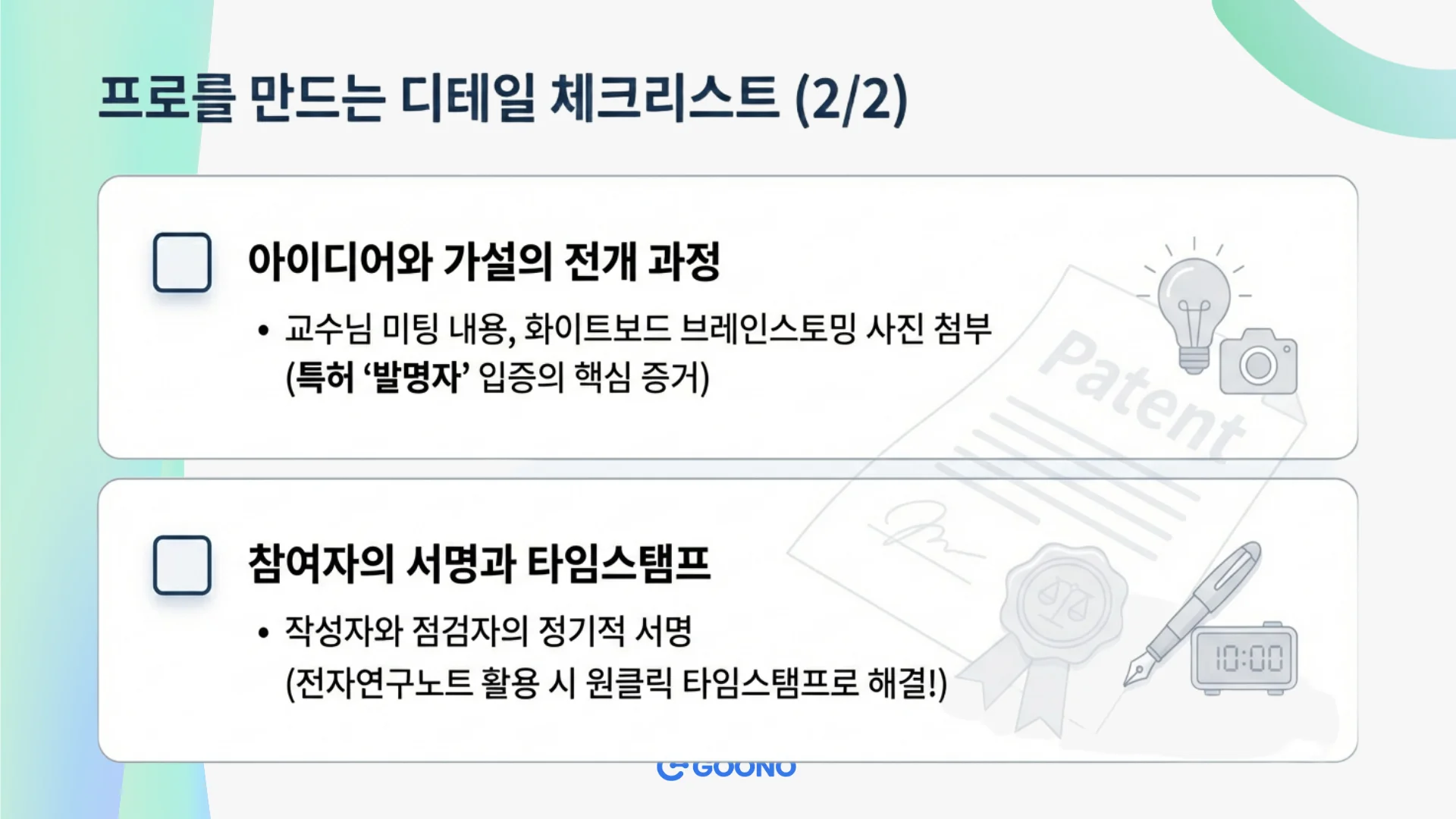 아이디어와 가설의 전개: 실험 결과뿐만 아니라, 교수님과의 미팅 중에 나온 아이디어나 화이트보드에 그렸던 브레인스토밍 내용도 사진을 찍어 첨부하세요. 훗날 특허 출원 시 '발명자'임을 입증하는 결정적인 증거가 됩니다.