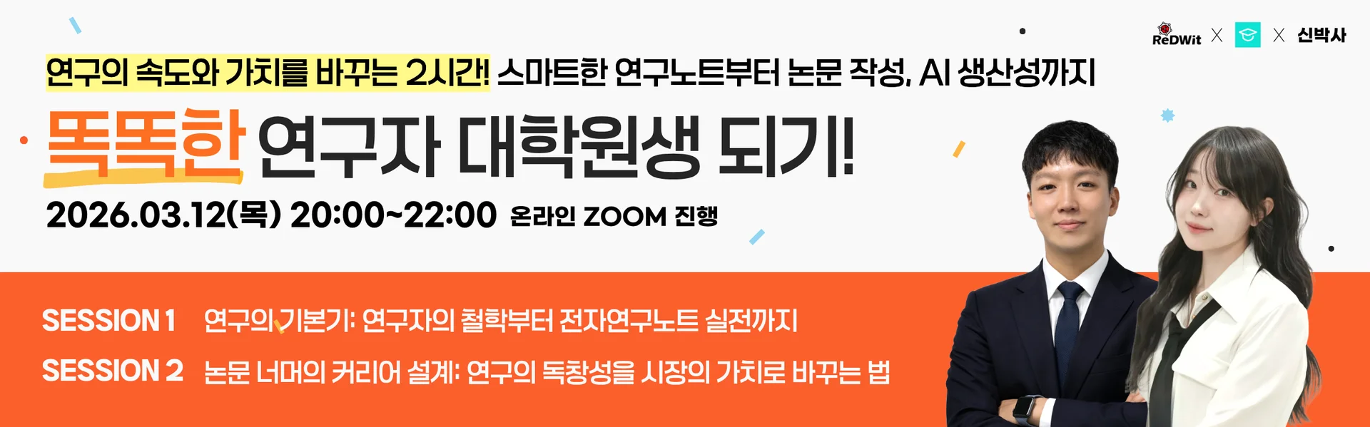 혼자 고민하지 마세요. 연구노트의 정석부터 논문 전략, 커리어 설계, 그리고 AI 활용법까지 한자리에 모은 역대급 웨비나를 소개합니다.